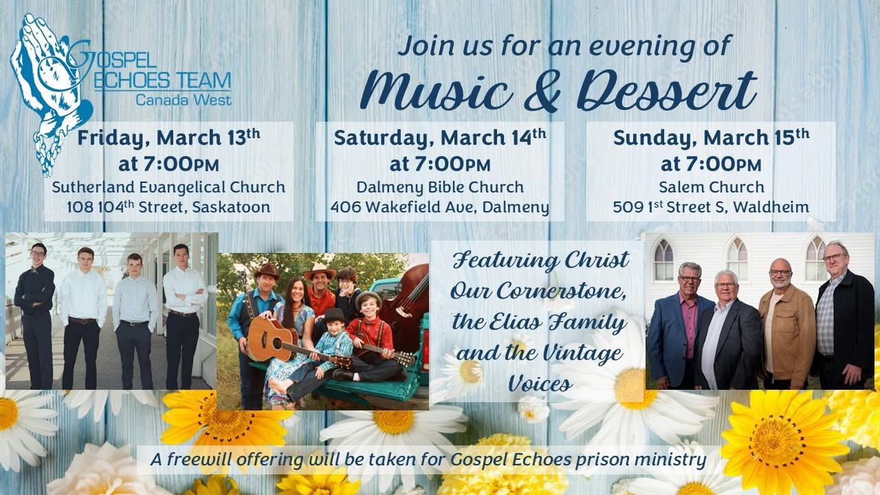 Gospel Echoes will be doing a Music and Dessert Fundraiser on March 15th at Salem at 7pm. Christ our Cornerstone, The Elias Family, and The Vintage Voices men’s quartet will be performing and a freewill offering will be taken for Gospel Echoes prison ministry.