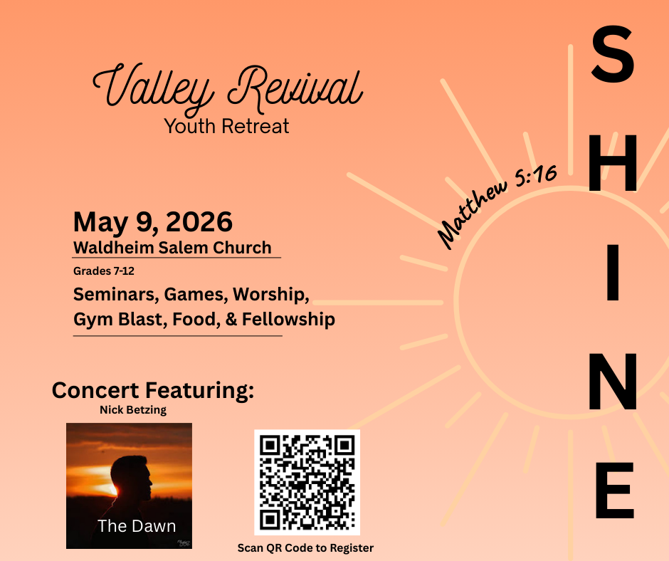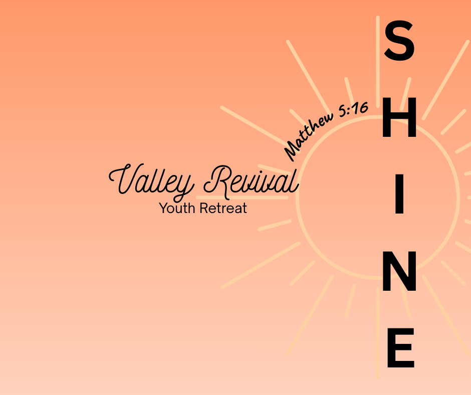 Valley Revival is a youth retreat that desires to encourage youth to grow in their relationship with Jesus and to introduce youth to Jesus for the first time. Our theme for this event is SHINE based upon Matthew 5:16 which says, “In the same way, let your light shine before others, so that they may see your good works and give glory to your Father who is in heaven.” Throughout the seminars, worship, message and concert, the desire is to give examples of how to let the Light, who is Jesus, shine before others.